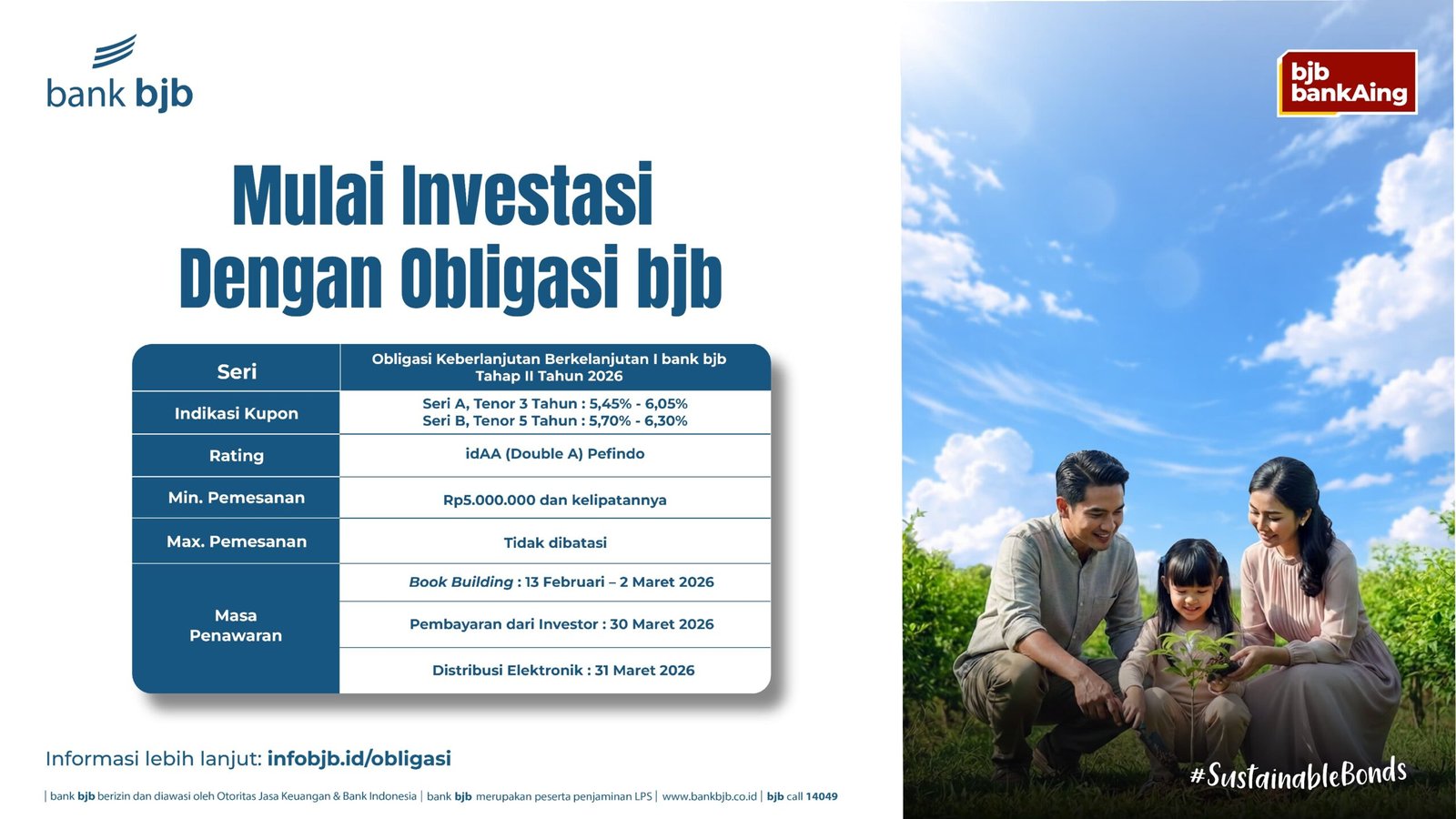 HALOJABAR.CO – bank bjb kembali menghadirkan pilihan investasi strategis melalui penerbitan Obligasi Keberlanjutan Berkelanjutan I Tahap II Tahun 2026. Produk ini menjadi bagian dari komitmen perseroan dalam memperkuat struktur pendanaan sekaligus memperluas pembiayaan berbasis keberlanjutan di Indonesia.